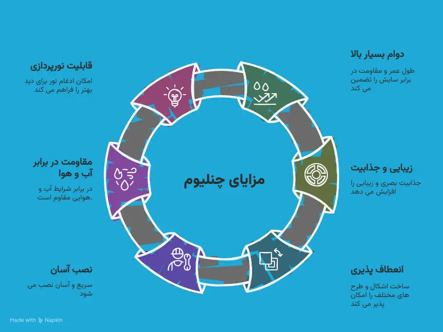 چنلیوم به دلیل مقاومت بالا در برابر شرایط جوی، دوام طولانی، و قابلیت انعطافپذیری در طراحی، انتخابی عالی برای ساخت تابلوهای تبلیغاتی است.